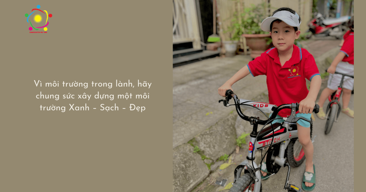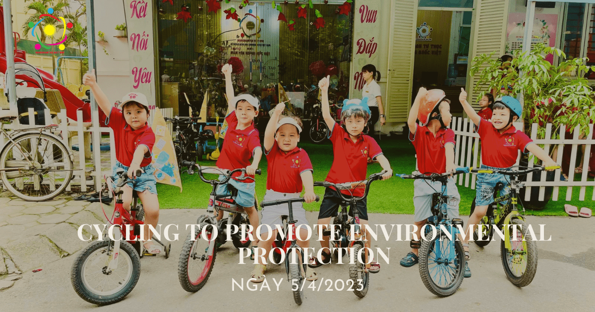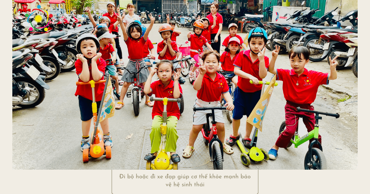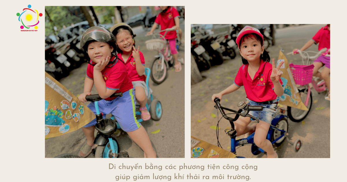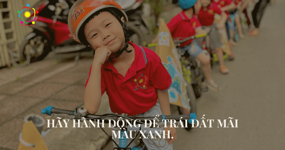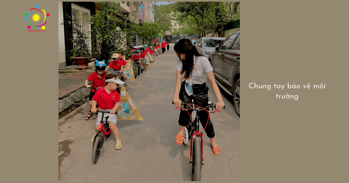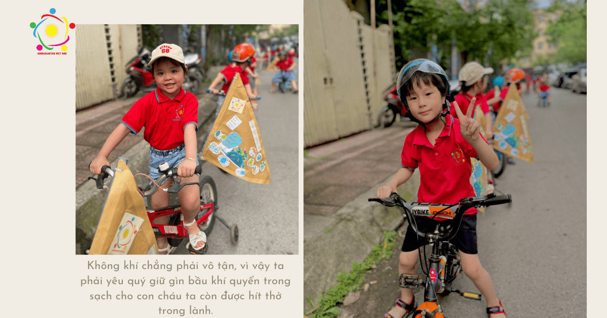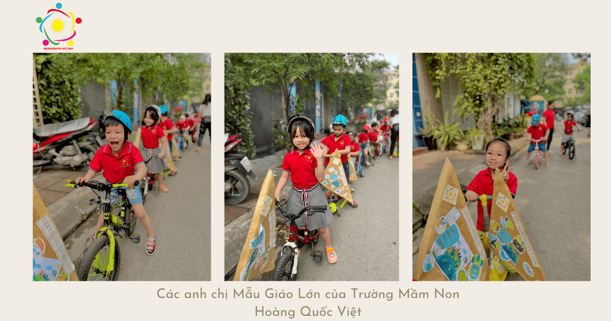 Diễu hành đạp xe nhằm tuyên truyền các thông điệp xanh để hưởng ứng Thông điệp bảo vệ môi trường là hoạt động đầu tiên trong chuỗi các hoạt động đóng dự án tái chế của trường mầm non Hoàng Quốc Việt ![]()